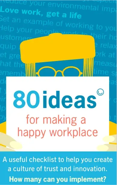 This three-page PDF document is a useful checklist with 80 ideas to help you create a happy workplace based around the principles of the Happy Manifesto. Start by ticking the things that you do already. If you don’t but you think it is a good idea, assess if it is easy to do, or requires more effort and is a medium-term solution – or, if you don’t like the idea, tick ‘bad idea’. How many ideas could you implement?
